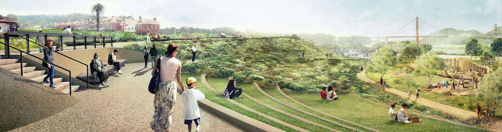 Diseñado por James Corner Field Operations (la empresa detrás de la High Line de Nueva York), Presidio Tunnel Tops contará con impresionantes vistas panorámicas del puente Golden Gate y de la ciudad así como senderos y jardines, además habrá un welcome center con venta de comida y servicios para los visitantes, círculo de fogatas, áreas de picnic y más. Los visitantes pueden aprender sobre la naturaleza, explorar y divertirse en Crissy Field Center ampliado, el área de juegos natural "Outpost" y la nueva Field Station.